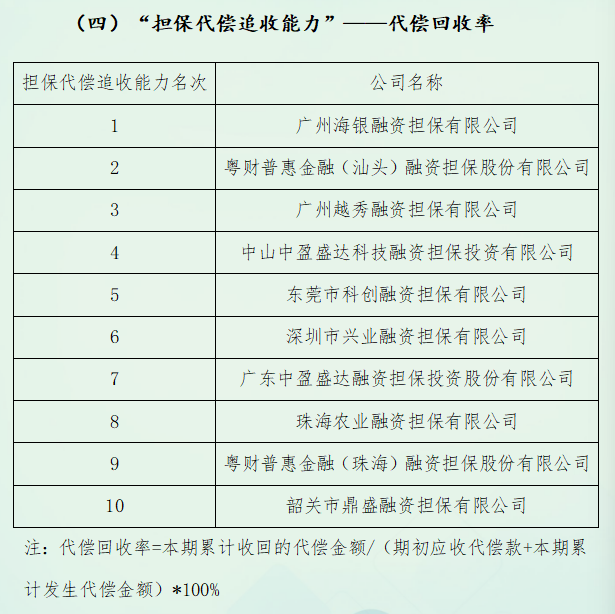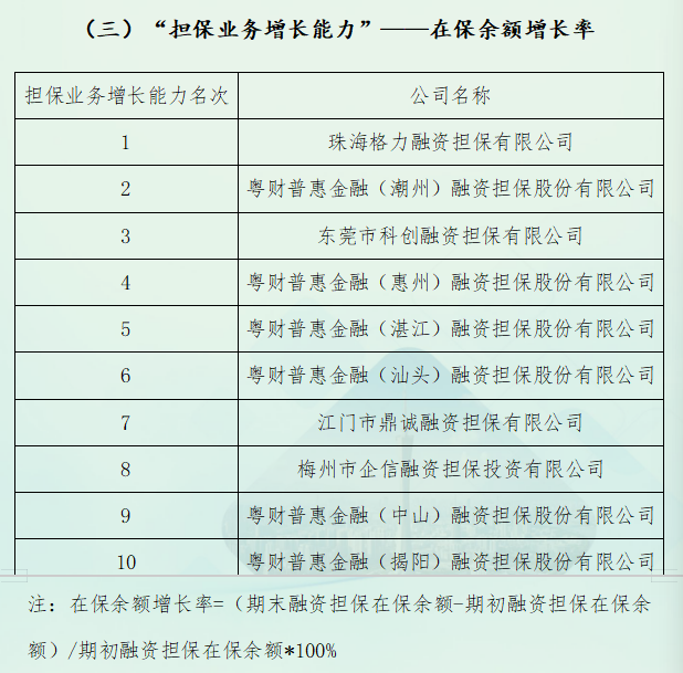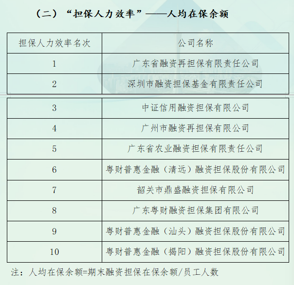 关于2024年度广东省融资担保业协会会员机构融资担保业务单项指标排名的公告 发表日期:2025-11-04 来源:本网 由协会秘书处与从会员单位中遴选的优秀专业人员共同组成的《广东省融资担保行业发展调研报告》课题研究小组,经过半年多的资料收集、筛选整理、数据分析、讨论研究、梳理编撰等环节工作,近日已圆满完成2025年度《广东省融资担保行业发展调研报告》课题研究及其编撰工作。 该报告系统梳理了2024年度融资担保行业的整体发展态势和特征,深入分析了广东省融资担保行业发展的规律性特点,并从担保机构“担保资本效率”“担保人力效率”“担保业务增长能力”及“担保代偿追收能力”四个直保业务主要单项指标进行对比排序分析。 现将前十名机构具体排名情况予以公告。