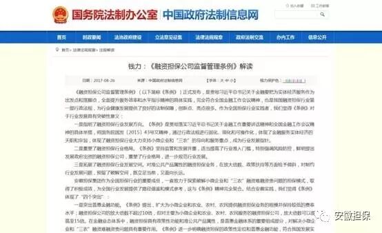 钱力受国务院法制办之邀 深度解《担保监管条例》 发表日期:2017-09-07 来源:安徽信用担保协会 开始2017年8月21日,国务院颁布了《融资担保公司监督管理条例》(以下简称《条例》)并将于2017年10月1日起施行。《条例》从立法层面明确了融资担保机构的法律地位,为解决小微企业和“三农”融资难融资贵问题,促进融资担保行业健康发展、充分发挥支持小微企业和“三农”作用提供良好的法制保障,具有重要作用。我会会长,省担保集团党委书记、总经理钱力同志受国务院法制办之邀,对《融资担保公司监督管理条例》进行了深度,现全文转载如下(原文链接:http://www.chinalaw.gov.cn/art/2017/8/26/art_13_206083.html)。 《融资担保公司监督管理条例》(以下简称《条例》)正式发布,是贯彻习近平总书记关于金融要把为实体经济服务作为出发点和落脚点,全面提升服务效率和水平指示精神的具体实践,完全符合全国金融工作会议精神,也是我国融资担保行业第一部行政法规,为行业健康发展提供了良好的法制保障,创新点、亮点很多。作为全国担保行业实践者,我们觉得《条例》对于行业发展具有突破性意义: 指明了融资担保行业发展方向 《条例》是贯彻落实习近平总书记关于金融工作重要讲话精神和全国金融工作会议精神的具体举措,将国务院国发〔2015〕43号文精神,通过行政法规进行固化、细化和可操作化,体现了金融服务实体经济的天职和宗旨,体现了融资担保行业大力支持小微企业和“三农”的导向和服务重点,成为行业发展指针。 重塑了融资担保行业格局 《条例》坚持监管和发展并重,适当提高了行业准入门槛,特别强调风险防控,鲜明提出发展政府出资的融资担保公司,重塑了行业格局,进一步规范行业发展。 拓展了融资担保行业发展空间 对准公共产品属性的融资担保业务,在放大倍数、政策扶持等方面给予倾斜,对制约行业发展问题,预留了破解空间,既立足当前,又面向长远。 一、突出普惠金融功能 开始《条例》提出,扩大为小微企业和农业、农村、农民提供融资担保业务的规模并保持较低的费率水平;融资担保公司的放大倍数不超过10倍,但对主要为小微企业和农业、农村、农民服务的融资担保公司,放大倍数可以提高至15倍。在金融业态体系中,融资担保具有政策性功能和准公共产品属性,是普惠金融体系的重要组成部分,对解决小微企业和“三农”融资难融资贵问题具有重要作用。《条例》进一步明确融资担保的政策性定位和普惠金融功能,符合我国发展实际,也与世界主流担保模式高度一致。 第二在实践中,安徽按照“扶小微、广覆盖、低费率、控风险、可持续”的原则,将服务小微企业和“三农”的担保业务明确为政策性担保,由政策性担保机构承担,并界定了政策性担保机构的标准,努力践行普惠金融。在服务对象上,服务和支持担保贷款额度2000万元以下的小微企业,农业担保服务带动力强的种养大户、家庭农场、农民合作社等农业适度规模经营主体,确保金融活水精准流向小微群体。在融资成本上,担保费率不高于1.5%(2016年进一步降至1.2%),确保小微企业融资成本保持在较低水平。在机构准入上,加入全省政策性担保体系的担保机构,服务小微企业的业务比重,市级不低于70%,县级不低于90%,确保担保机构服务小微不偏离。 二、突出担保体系建设 第二《条例》提出,国家推动建立政府性融资担保体系。完备的担保体系是担保机构与银行高效对接合作的关键,也是促进行业健康可持续发展的保障和支撑。在实践中,安徽在省级层面统筹规划、建设和推进全省政策性担保体系建设,以股权、再担保、信息技术和党建为纽带,在全国率先构建了省、市、县三级全覆盖的政策性担保体系,彻底改变了原先担保机构“小、弱、散”的状况,实现与银行进行体系和体系对接,重组了行业内部秩序,形成了发展合力,有效解决了小微企业和“三农”融资难题。 第二2013年以来,省市县三级共安排250多亿元财政资金,注入国有担保机构,支持体系建设,突破资金不足的瓶颈,壮大资本实力,提升服务能力。安徽政策性担保体系通过再担保业务,分散和对冲担保体系内部风险,防止出现系统性风险;通过联保、分保,促进业务水平提升。截至2017年上半年,全省政策性担保体系(129家)净资产523.46亿元,在保余额1571.18亿元,服务小微企业(包括个体工商户、农户)约2万户,以全省37%的机构数和63%的净资产,完成了全省81%在保余额。 第二在政策性担保体系的有力带动和强力支撑下,截至6月末,全省融资担保业务余额突破1900亿元,约占同期全部企业贷款余额的10%,高于全国平均水平约8个百分点,其中小微企业融资担保余额占全部小微企业贷款余额超过20%,远高于全国平均水平。安徽政策性担保体系成为各级政府做好经济金融工作的重要抓手,成为逆经济周期“调节器”、“减震器”。 三、突出风险分担机制建立 第三《条例》提出,建立政府、银行业金融机构、融资担保公司合作机制。从银担合作到政银担合作,是行业发展质的飞跃,也是根本性变化,彻底改变了长期以来银担合作不对等、不通畅的痼疾,而且通过风险分担实现风险共管,切实降低风险,更直接降低了担保准入门槛,提高了小微企业的金融服务获得率。 第二在实践中,2015年,安徽率先在全国建立“4321”新型政银担合作机制,对单户2000
