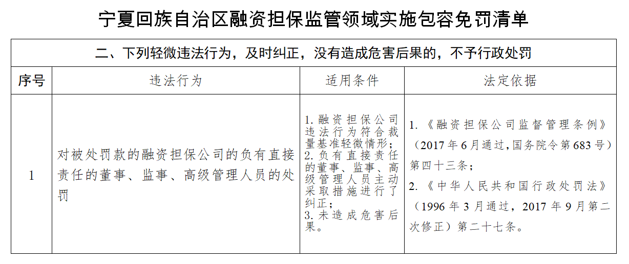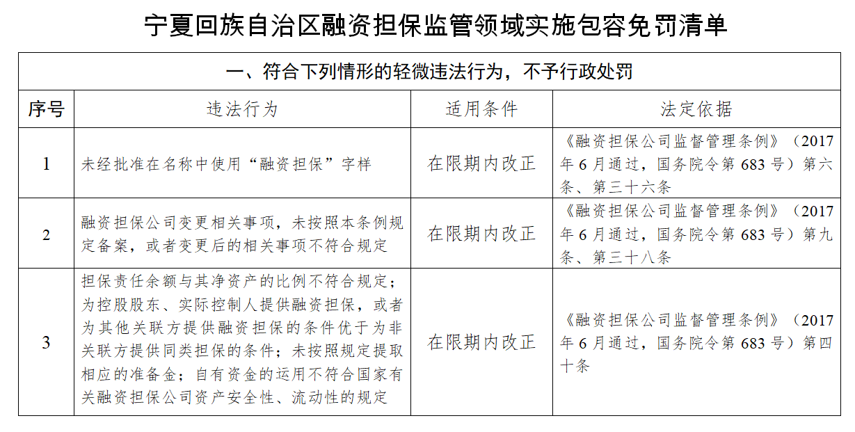宁夏回族自治区地方金融监管局关于《宁夏回族自治区融资担保监管领域实施包容免罚清单》的公告 发表日期:2020-12-07 来源:宁夏回族自治区地方金融监管局 为推行包容审慎监管,发挥法治引领和保障作用,进一步优化营商环境,按照《国务院关于做好自由贸易试验区第六批改革试点经验复制推广工作的通知》(国函〔2020〕96号)和《宁夏回族自治区人民政府关于印发深化“放管服”改革优化营商环境若干措施的通知》(宁政规发〔2020〕5号)有关精神,根据《中华人民共和国行政处罚法》、《融资担保公司监督管理条例》等规定,自治区地方金融监管局制定了《宁夏回族自治区融资担保监管领域实施包容免罚清单》,现向社会公告。 自治区地方金融监管局 2020年12月4日