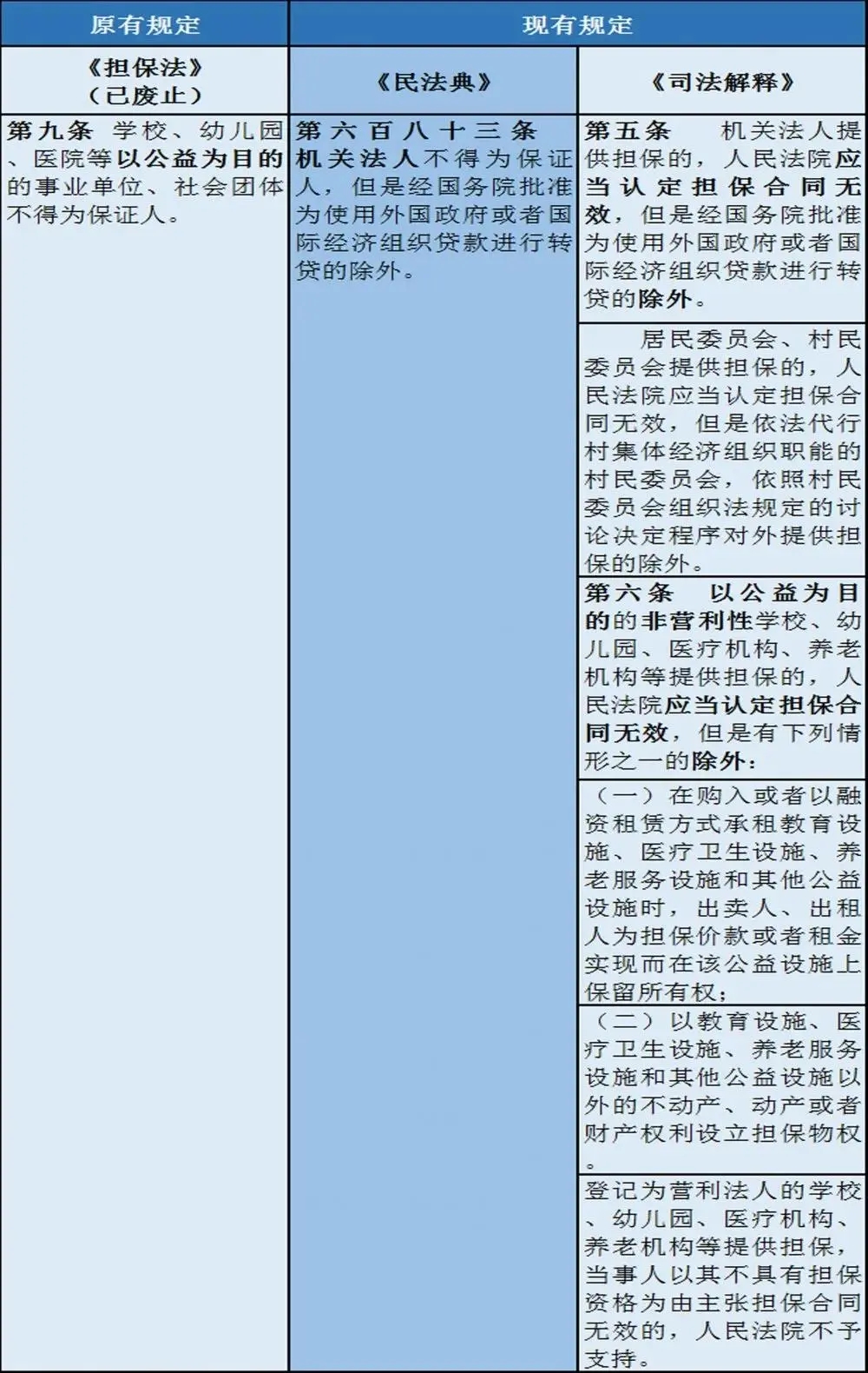 【微课堂】《民法典》时代下担保制度的十三处变化 发表日期:2021-03-22 来源:《民法典理解与适用》、信贷风险管理 《民法典》对我国担保法律制度进行了重大修改、完善,最高人民法院《关于适用<中华人民共和国民法典>有关担保制度的解释》(以下简称《司法解释》)是在对原担保法司法解释等在内的与担保有关的10个司法解释进行梳理、清理、吸收和完善的基础上制定的,主要对担保的从属性、保证人范围、保证方式的认定、保证期间与诉讼时效的衔接、共同保证人之间的关系、抵押财产转让、动产抵押制度等方面进行了新规定。 一、不得担任保证人的情形 《民法典》第683条对不得作为保证人的主体范围进行了规定,较原《担保法》第9条列举式的规定,《民法典》对主体根据性质进行了区分,同时与《民法典》总则中的概念进行了衔接。《司法解释》第5条、第6条亦有细化规定。以公益为目的的非营利法人、非法人组织原则上不得为保证人。 案例君补充:《民法典》第97条规定,有独立经费的机关和承担行政职能的法定机构从成立之日起,具有机关法人资格,可以从事为履行职能所需要的民事活动。据此,机关法人只能从事为履行职能所需要的民事活动,显然,担保不属于为履行职能所需要的民事活动。但本条又规定了例外情形。目前,我国吸收外国政府或者国际经济组织贷款后,即将这些贷款按项目转贷给地方政府或者有关部门特定项目使用。由于这些贷款多用于交通运输、能源、环保等基础项目,资金需求量大,不盈利或者盈利有限,单靠项目使用单位无法偿还贷款,也没有单位或者个人愿意为这些项目作保证人,所以在此问题上形成了独特的还款和担保方式。