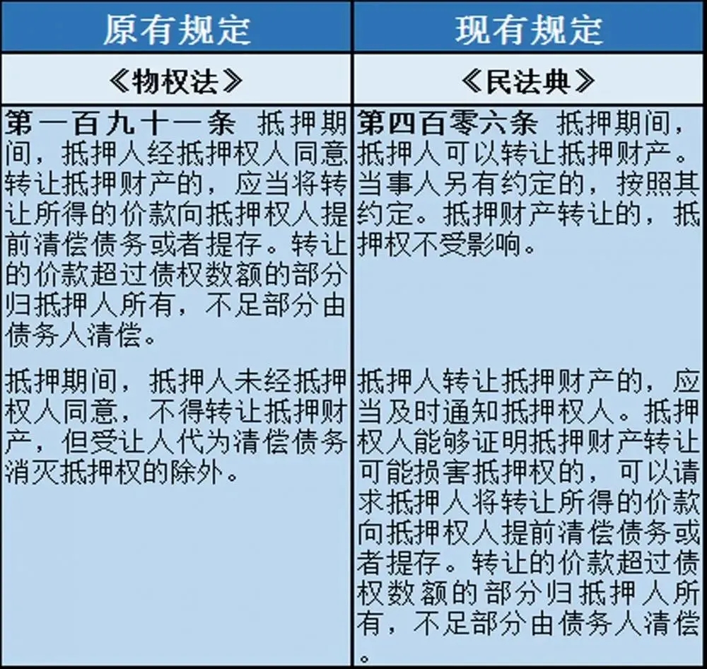 十、抵押财产可以转让 《民法典》第406条对《物权法》第191条作出了重大修改,规定抵押期间抵押人转让抵押财产不再需要抵押权人的同意。但此系任意性规定,且抵押财产的转让不影响抵押权的行使。