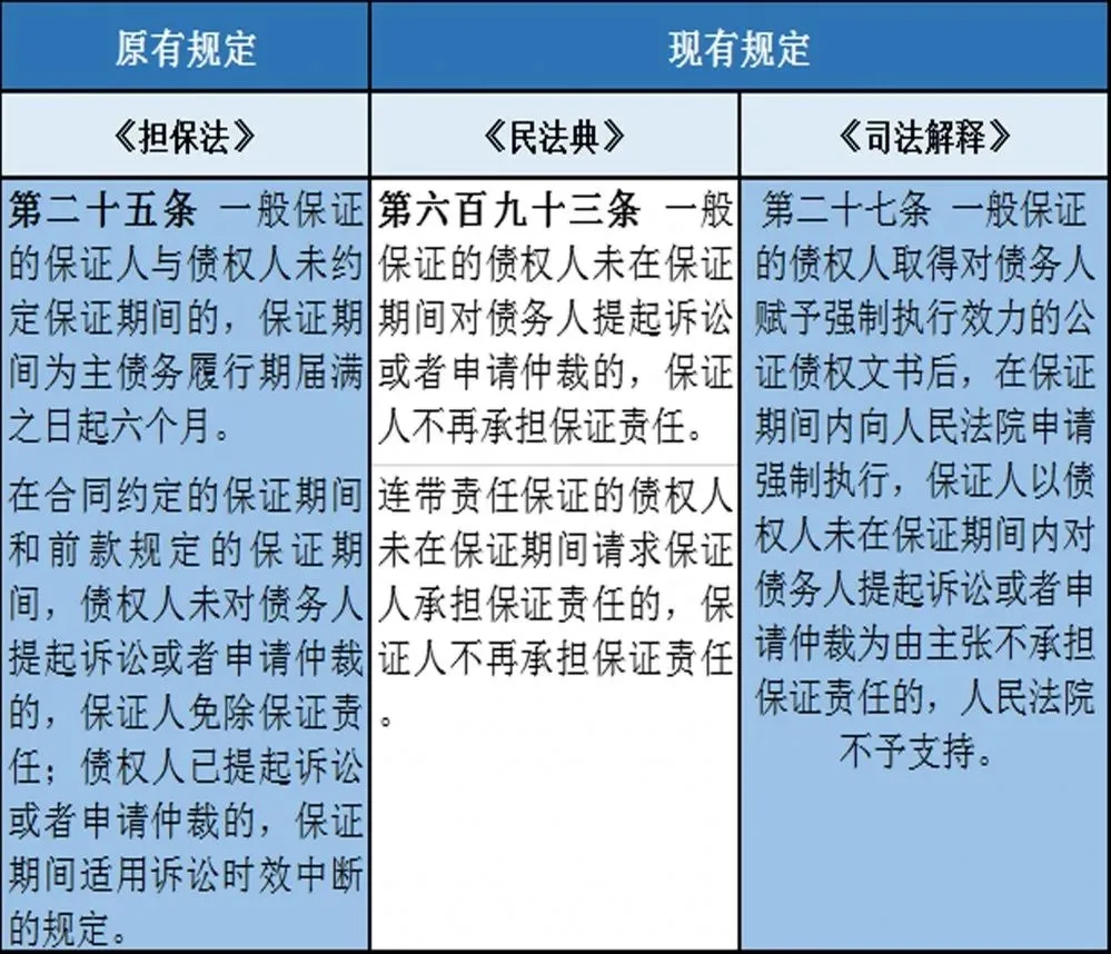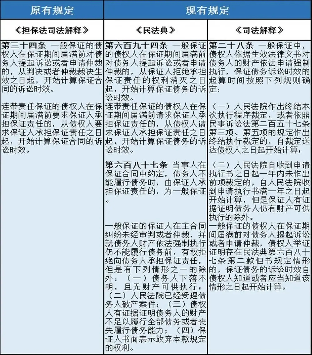 五、保证债务的消灭 区别于原《担保法》第25条,《民法典》第693条删去了诉讼时效中断的规定,债权人在保证期间内不行使权利的,将产生权利消灭的后果。 同时,《民法典》对一般保证和连带保证进行了区分:对于一般保证,由于保证人享有先诉抗辩权,债权人必须在保证期间内通过对债务人提起诉讼或者申请仲裁的方式行使,否则,保证责任消灭,保证人不再承担保证责任。而连带保证责任不同,由于连带责任保证人不享有先诉抗辩权,所以,债权人只有在保证期间内对保证人主张承担保证责任的,保证人才承担保证责任。否则,保证责任消灭,保证人不再承担保证责任。同时,对于一般保证而言,根据《司法解释》第27条的规定,债权人在保证期间内依据具有强制执行效力的公证债权文书申请人民法院强制执行的,即使其未对债务人提起诉讼或申请仲裁,也不应认定产生一般保证人保证责任消灭的后果。