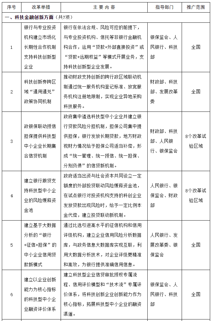 国务院办公厅:推广政银保联动授信担保;建立基于大数据分析的“银行+征信+担保”的中小企业信用贷款新模式 发表日期:2020-03-30 来源:中国政府网 日前,国务院办公厅印发《关于推广第三批支持创新相关改革举措的通知》,明确提出,要大力推广政银保联动授信担保提供科技型中小企业长期集合信贷机制。政府集中遴选科技型中小企业并建立银行贷款风险分担机制,担保公司集中提供担保,银行发放长期贷款,地方财政视财力情况给予担保公司适当补偿,形成“统一管理、统一授信、统一担保、分别负债”的信贷新机制。 建立基于大数据分析的“银行+征信+担保”的中小企业信用贷款新模式。通过比选引进高水平的征信机构和信用评级机构,建立企业信用风险分析数据库,与政务信息大数据库实现互联,利用大数据分析技术,对企业评级更精准和高效,为银行提供准确信用信息。 国务院办公厅 关于推广第三批支持创新相关改革举措的通知 各省、自治区、直辖市人民政府,国务院各部委、各直属机构: 为深入实施创新驱动发展战略,党中央、国务院在京津冀、上海、广东(珠三角)、安徽(合芜蚌)、四川(成德绵)、湖北武汉、陕西西安、辽宁沈阳等8个区域部署开展全面创新改革试验,着力破除制约创新发展的体制机制障碍,推进相关改革举措先行先试。有关地区和部门认真落实党中央、国务院决策部署,聚焦发挥市场和政府作用有效机制、促进科技与经济深度融合有效途径、激发创新者动力和活力有效举措、深化开放创新有效模式,大胆探索创新,取得了一系列改革突破,形成了若干新经验新成果,已于2017年、2018年分两批推广36项改革举措。为进一步发挥改革试验的示范带动作用,经国务院批准,决定在全国或8个改革试验区域内推广第三批20项改革举措。现就有关事项通知如下: 一、推广的改革举措 (一)科技金融创新方面7项:银行与专业投资机构建立市场化长期性合作机制支持科技创新型企业;科技创新券跨区域“通用通兑”政策协同机制;政银保联动授信担保提供科技型中小企业长期集合信贷机制;建立银行跟贷支持科技型中小企业的风险缓释资金池;建立基于大数据分析的“银行+征信+担保”的中小企业信用贷款新模式;建立以企业创新能力为核心指标的科技型中小企业融资评价体系;银行与企业风险共担的仪器设备信用贷。 (二)科技管理体制创新方面6项:集中科技骨干力量打造前沿技术产业链股份制联盟;对战略性科研项目实施滚动支持制度;以产业数据、专利数据为基础的新兴产业专利导航决策机制;老工业基地的国有企业创新创业增量型业务混合所有制改革;生物医药领域特殊物品出入境检验检疫“一站式”监管服务机制;地方深度参与国家基础研究和应用基础研究的投入机制。 (三)知识产权保护方面2项:建立跨区域的知识产权远程诉讼平台;建立提供全方位证据服务的知识产权公证服务平台。 (四)人才培养和激励方面1项:“五业联动”的职业教育发展新机制。 (五)军民深度融合方面4项。 二、结合各自实际,深化改革探索 各地区、各部门要以习近平新时代中国特色社会主义思想为指导,深入贯彻党的十九大和十九届二中、三中、四中全会精神,坚定实施创新驱动发展战略,以钉钉子精神巩固完善全面创新改革试验成果,真正取得扎实成效。要把推广第三批改革举措与巩固落实第一批、第二批改革举措结合起来,同一领域的改革举措要加强系统集成,不同领域的改革举措要强化协同高效,不断巩固和深化在解决体制性障碍、机制性梗阻和开展政策性创新方面取得的改革成果,推动各方面制度更加成熟更加定型,真正把制度优势转化为治理效能。要认真梳理和总结本地区、本部门全面创新改革试验工作的成效和经验,在充分发挥已推广改革举措和典型经验示范带动作用的同时,继续加强和深化改革创新探索实践,进一步聚焦重点领域和关键环节,不断激发市场活力和社会创造力,推动经济持续健康发展。 三、明确主体责任,抓好组织实施 各省(区、市)人民政府要加强对全面创新改革试验工作的组织领导,着力以改革疏通堵点、破解痛点、攻克难点。要健全完善激励机制,细化实化任务分工,确保改革举措落地生根,更好服务经济社会发展。要结合本地区、本部门具体工作实际,坚持因地制宜、实事求是,务求取得实效。要充分调动各方面的积极性、主动性和创造性,进一步推动形成担当作为、勇于创新的工作作风,营造有利于创新创业创造的良好社会环境。 国务院各有关部门要结合各自职责,积极主动作为、加强政策协同、做好工作衔接,加强对本领域全面创新改革试验工作的支持和指导。国家发展改革委和科技部要发挥牵头部门作用,做好统筹协调,加强政策解读,总结宣传典型经验和成效,重要情况和问题及时向国务院报告。 附件:第三批支持创新相关改革举措推广清单 国务院办公厅 2020年1月23日 附件 第三批支持创新相关改革举措推广清单