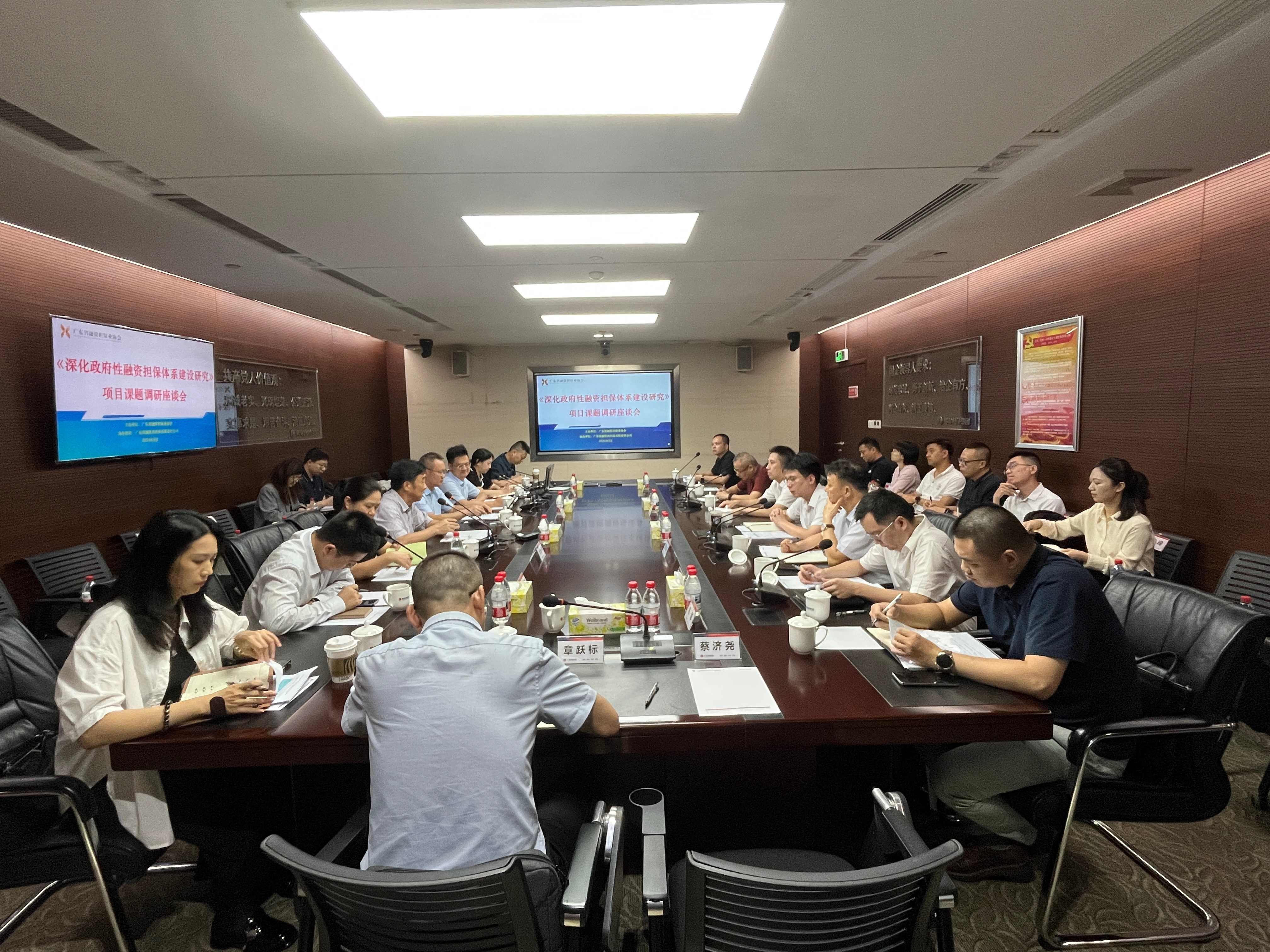 广东省融资担保业协会召开《深化政府性融资担保体系建设研究》项目课题调研座谈会 发表日期:2025-08-05 来源:本网 近日,为进一步推进我省政府性融资担保体系建设,深化政府性融资担保政策落实,广东省融资担保业协会(下称“协会”)联合广东财经大学课题组成员组织召开了两场“省财政厅《深化政府性融资担保体系建设研究》项目课题调研座谈会”,先后在广东省农业融资担保有限责任公司(下称“省农担公司”)和广东省融资再担保有限责任公司(下称“省再担保公司”)举行。 座谈会旨在深入探讨我省政府性融资担保体系建设现状,担保机构业务情况、面临问题及发展建议,为课题研究做好前期调查准备工作。协会秘书长张德本主持会议,课题组负责人广东财经大学副教授李利平、部分课题组成员和政府性融资担保机构主要负责人参加座谈。