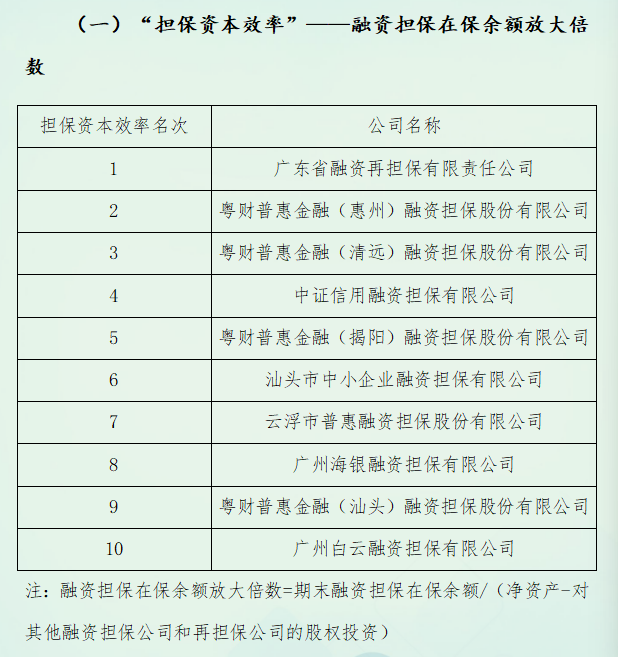 关于2024年度广东省融资担保业协会会员机构融资担保业务单项指标排名的公告 发表日期:2025-11-04 来源:本网 由协会秘书处与从会员单位中遴选的优秀专业人员共同组成的《广东省融资担保行业发展调研报告》课题研究小组,经过半年多的资料收集、筛选整理、数据分析、讨论研究、梳理编撰等环节工作,近日已圆满完成2025年度《广东省融资担保行业发展调研报告》课题研究及其编撰工作。 该报告系统梳理了2024年度融资担保行业的整体发展态势和特征,深入分析了广东省融资担保行业发展的规律性特点,并从担保机构“担保资本效率”“担保人力效率”“担保业务增长能力”及“担保代偿追收能力”四个直保业务主要单项指标进行对比排序分析。 现将前十名机构具体排名情况予以公告。