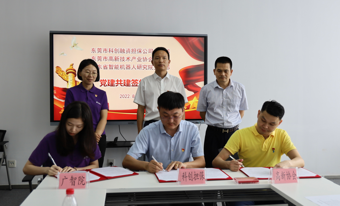 结对共建聚合力 党建引领促发展——科创担保公司党支部与高新协会党支部、广智院党支部开展党建共建活动 发表日期:2022-09-01 来源:东莞科创担保 为充分发挥基层党组织战斗堡垒作用和党建引领作用,推动党建工作和业务工作深度融合,促进业务高质量发展,8月25日上午,东莞市科创融资担保有限公司(简称“科创担保”)党支部与东莞市高新技术产业协会(简称“高新协会”)党支部、广东智能机器人研究院(简称“广智院”)党支部举行结对共建活动,先后参观松山湖双创社区阳光雨党群服务中心、广智院和高新协会,并开展座谈交流和签订党建共建协议。科创金融集团党委委员、科创担保公司党支部书记、董事长柳景蛟,科创担保公司副总经理冉鑫,高新协会秘书长刁思勉,广智院党支部书记、副院长周晓晓,高新协会党支部书记、秘书长助理郭志刚,以及三个党支部近30名党员同志参加相关活动。